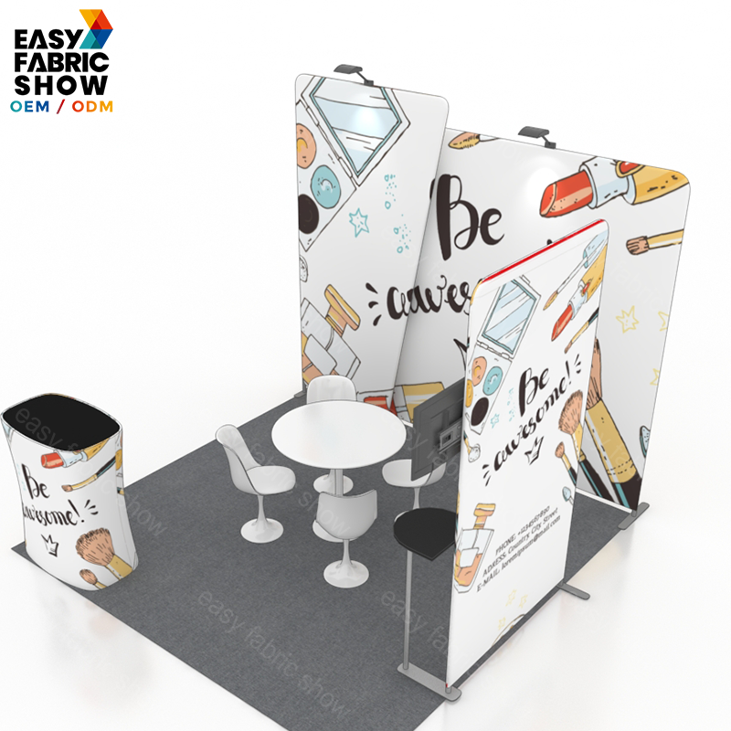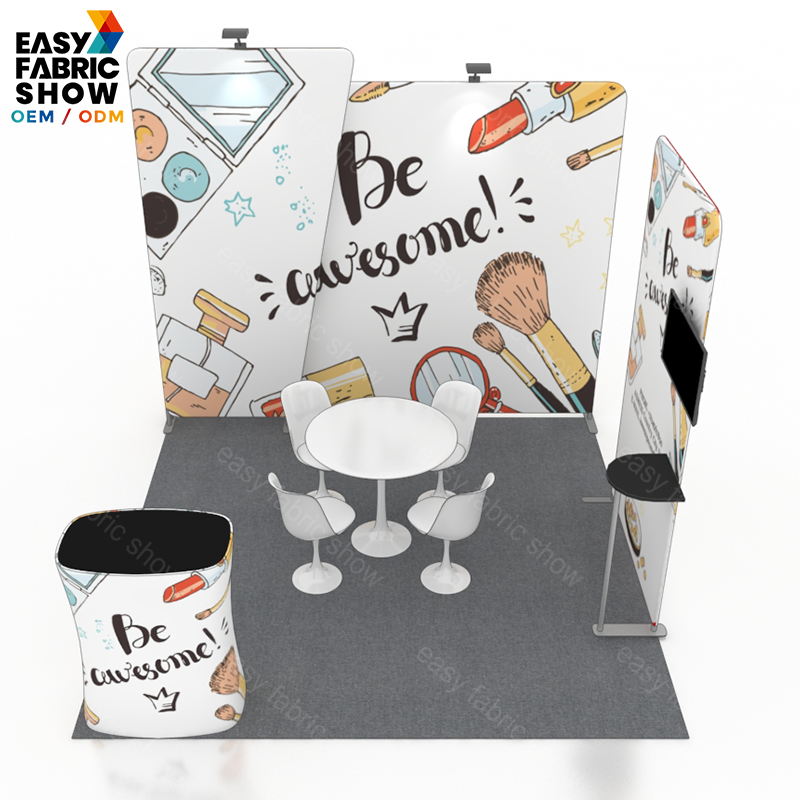 This 3x3 meter custom-printed fabric exhibition booth combines visual impact with functionality. Its vibrant, high-quality fabric printing ensures your brand stands out clearly, while integrated spotlights enhance visibility and highlight key areas. A built-in TV mount adds versatility, allowing dynamic presentations to engage visitors effectively. Designed for easy setup and professional display, this booth offers a compact yet powerful solution for trade shows and events.