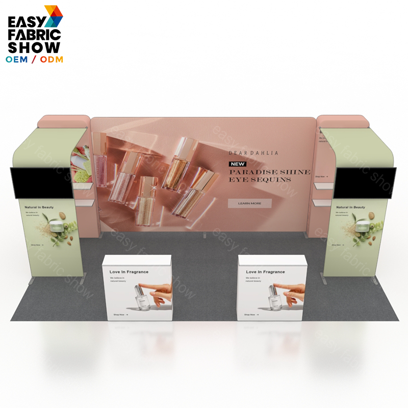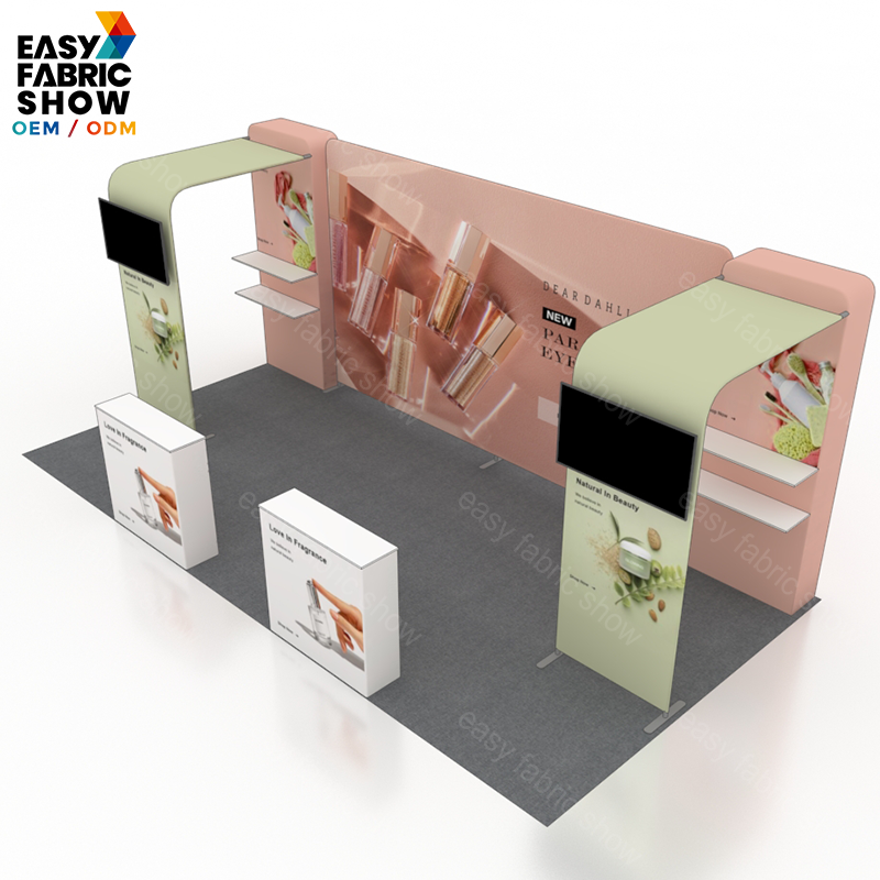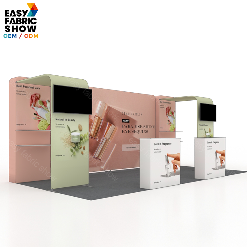 This 3x6 meter aluminum frame booth features a sleek arc-shaped design that maximizes visual impact while maintaining structural stability. The tension fabric graphics fit smoothly over the frame for a professional, wrinkle-free appearance. Integrated TV mounts enhance your presentation capabilities by allowing seamless multimedia displays. Ideal for exhibitions and trade shows, this booth combines durability with easy setup, offering a versatile and attractive solution for your marketing needs.