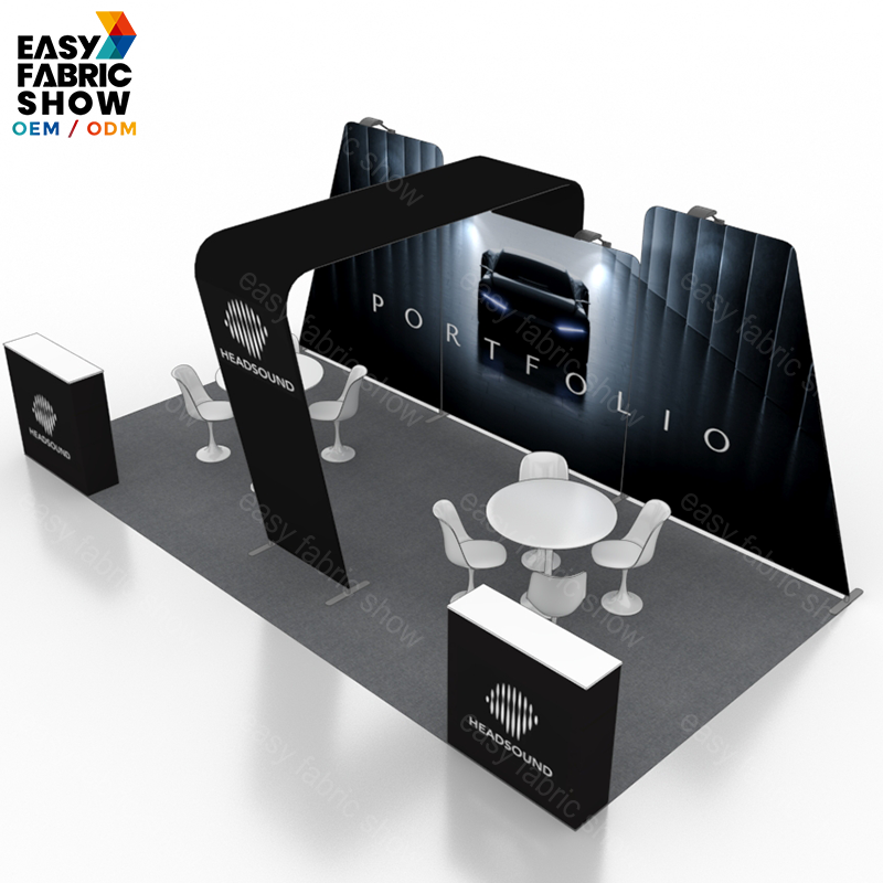 This 3x6 meter aluminum frame booth features a sleek arc-shaped design that maximizes visual impact while maintaining structural stability. The tension fabric graphics fit smoothly over the frame for a professional, wrinkle-free appearance. Integrated TV mounts enhance your presentation capabilities by allowing seamless multimedia displays. Ideal for exhibitions and trade shows, this booth combines durability with easy setup, offering a versatile and attractive solution for your marketing needs.